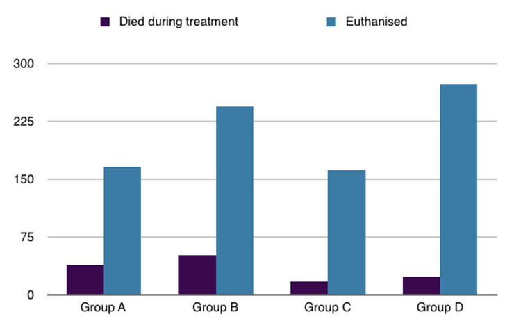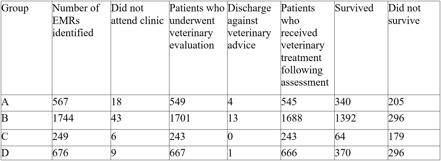 Methods: A retrospective review of canine and feline emergency admissions to emergency out-of-hours clinics (May 2012-January 2014) was conducted. Data recorded included age, nature of complaint, euthanasia/death during treatment, and survival to discharge. Survival to discharge included all patients who presented to the clinic for examination, received treatment and were subsequently discharged; this includes those patients who were discharged home or to their primary vets care. Patients were divided into four groups: canine patients ≤ 3 months of age and 3-6 months and feline patients ≤ 3 months of age and 3-6 months.