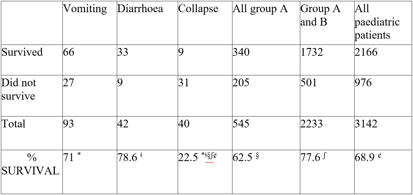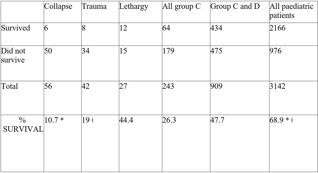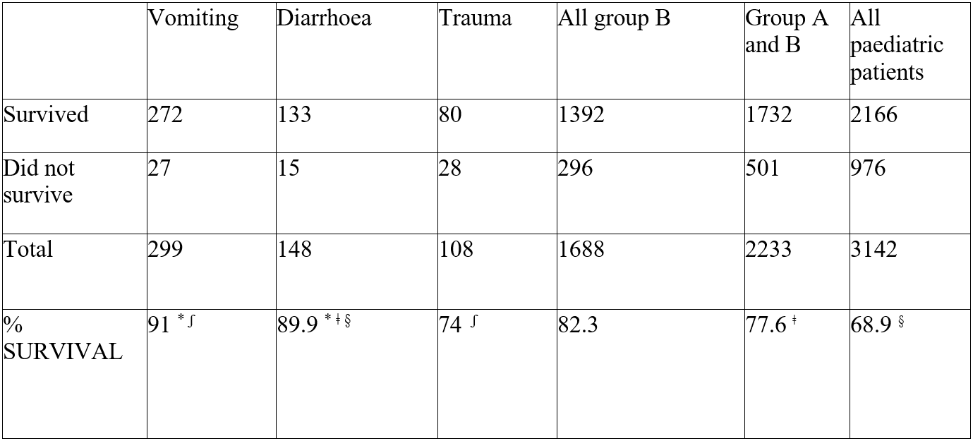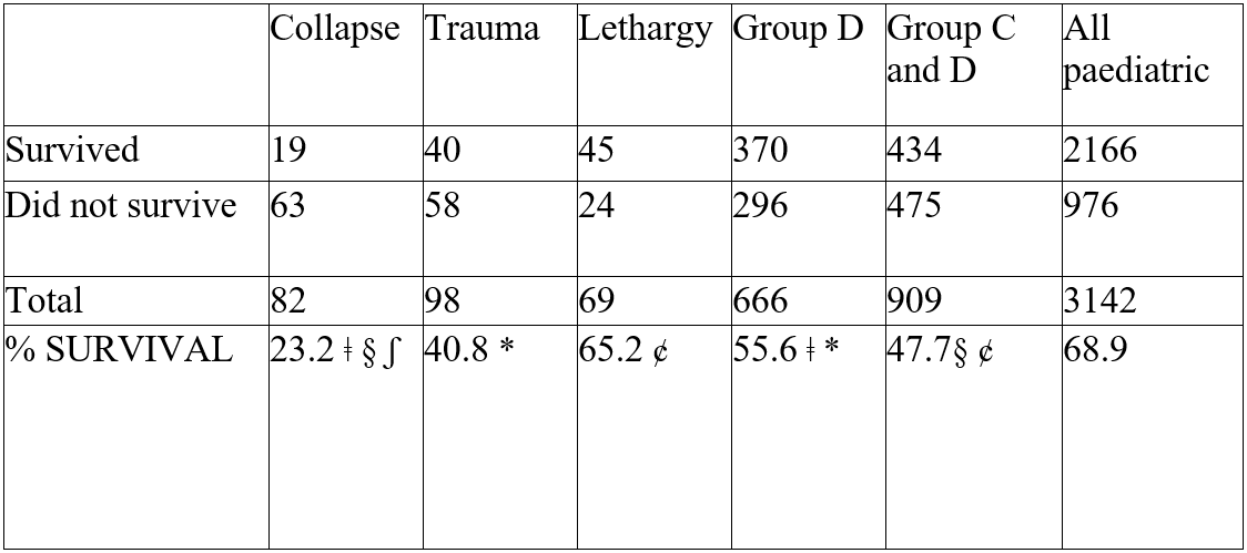 Conclusion: Paediatric patients have a low survival rate, indiscriminate of species and reason for presentation, with lower survival in younger animals; with a significant difference in survival between canine and feline patients.