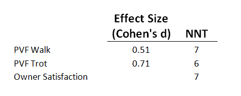 Results: The effect size of the peak vertical force (PVF) at a trot, 1 year after TPLO over LFS, was moderate to high (0.71) with a NNT of 6. The NNT for satisfaction was 7.