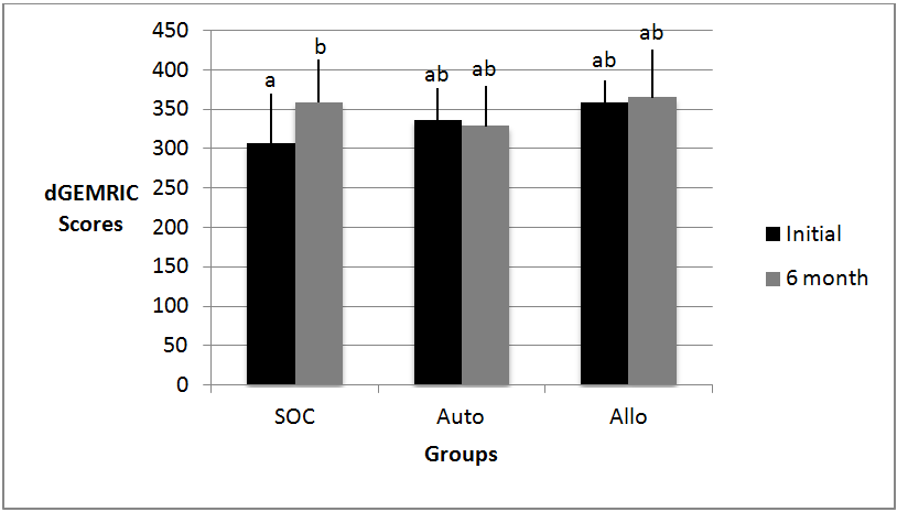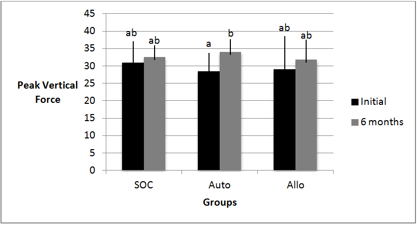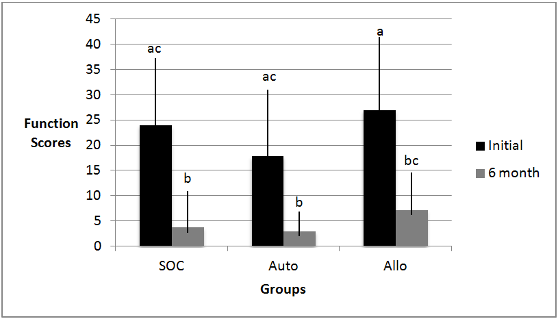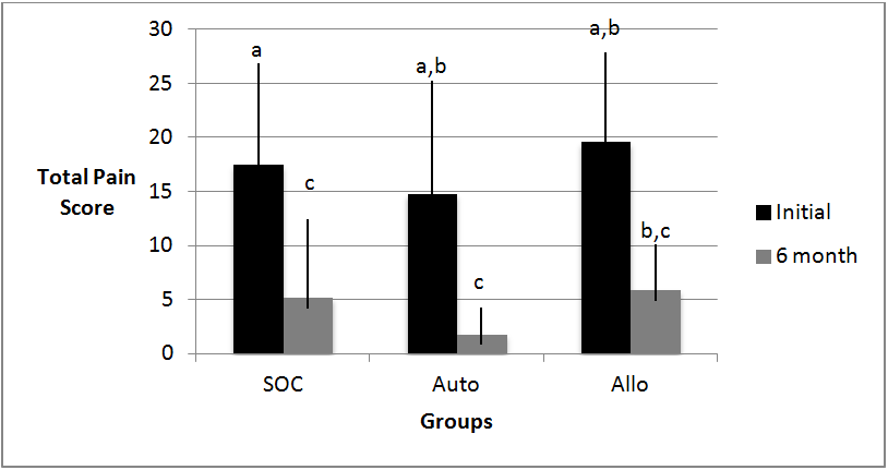 Methods: Dogs diagnosed with FMCP and osteoarthritis were enrolled. All dogs had arthroscopic fragment removal and proximal ulnar osteotomy (PUO) and were assigned into three groups (n=10/group): 1) control group with no further treatment beyond the PUO and fragment removal (SOC), 2) PUO + autologous ASCs and 3) PUO+ allogeneic ASCs. Each dog had force platform gait analysis, Canine Brief Pain Inventory (CBPI) questionnaires, and delayed gadolinium enhanced magnetic resonance imaging scores prior to and six months after therapeutic intervention.