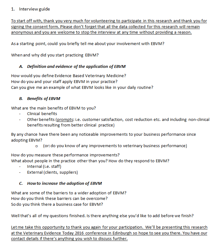 Methods: Due to the paucity of data about the non-clinical benefits of EBVM, an exploratory, qualitative approach was taken to this research in order to build a platform for further confirmatory, quantitative investigation (Zikmund, 2003). In February and March 2016 interviews with 16 RCVS Knowledge Group chairs[1] were conducted. The interview guide contained broad, open-ended questions to explore existing tacit knowledge about the non-commercial benefits of EBVM. The interviews were audio recorded and transcribed verbatim and subsequently analysed using NVivo 11 software.